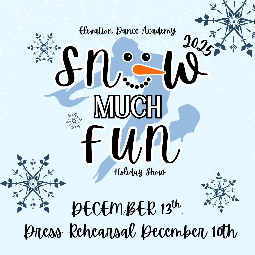 Get ready for a magical winter wonderland with Elevation Dance Academy’s 2025 Holiday Show: Snow Much Fun! December 13th @ Wasson High School. From snowflakes to smiles, this performance will bring the holiday spirit to life through music, movement, and joy! Click HERE to purchase your Holiday Show Tickets!